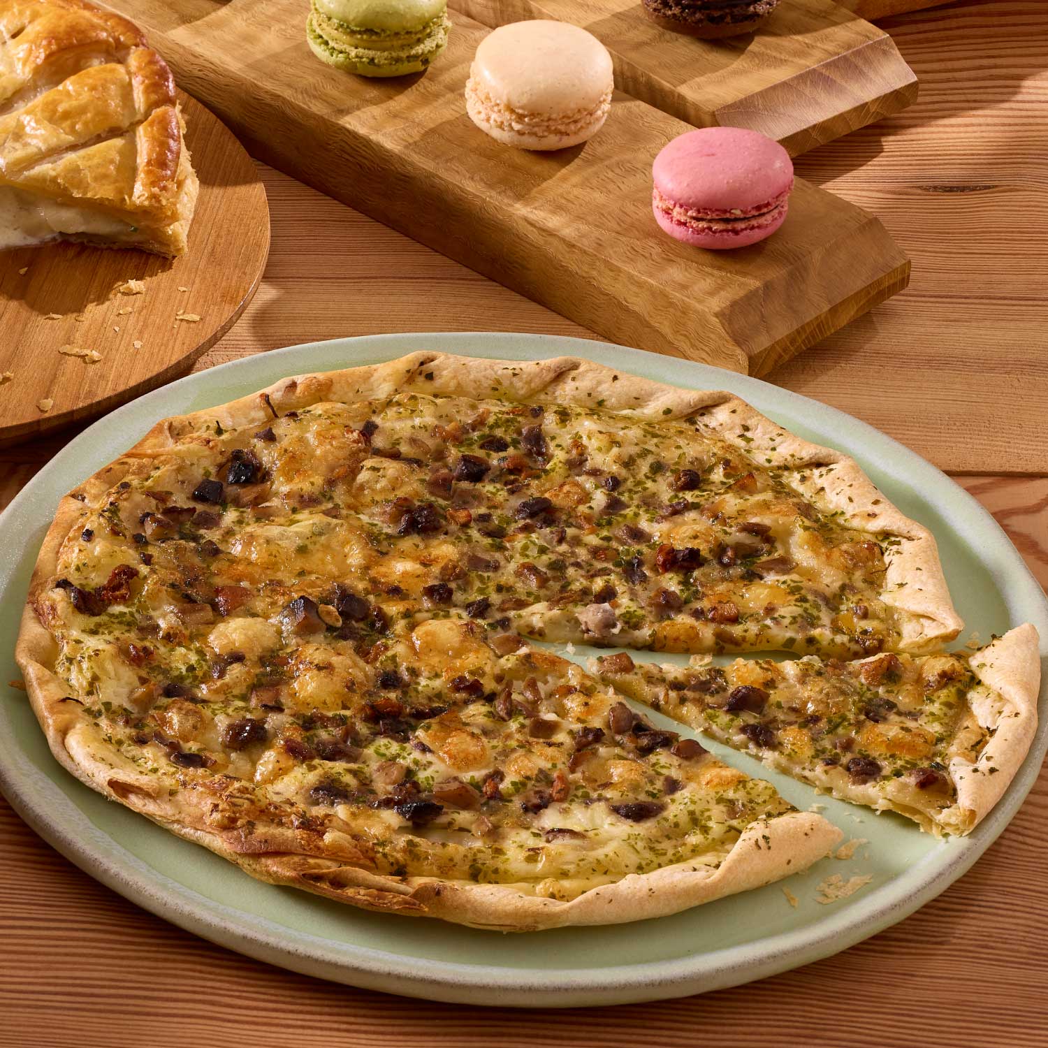 薄くのばしたタルト生地に4種類のキノコ(マッシュルーム、ヌメリイグチ、アンズタケ、ヤマドリタケ)にゴルゴンゾーラチーズをトッピングしたタルトです。秋を待たずにいつでも秋の味覚のきのこを楽しむことができる一品です。