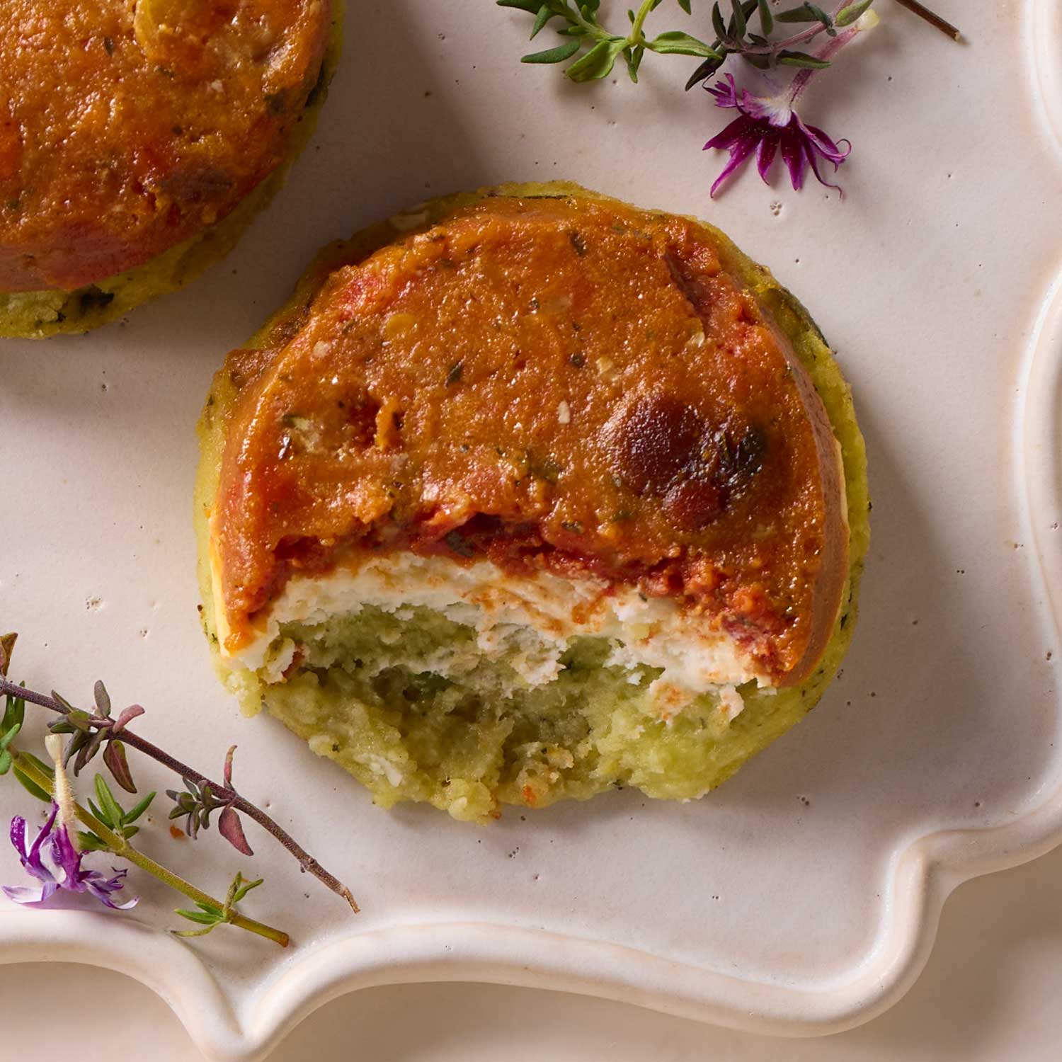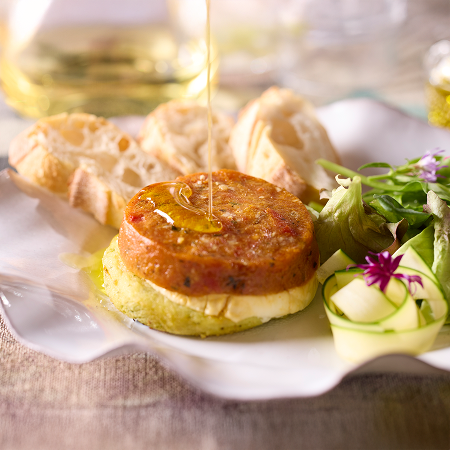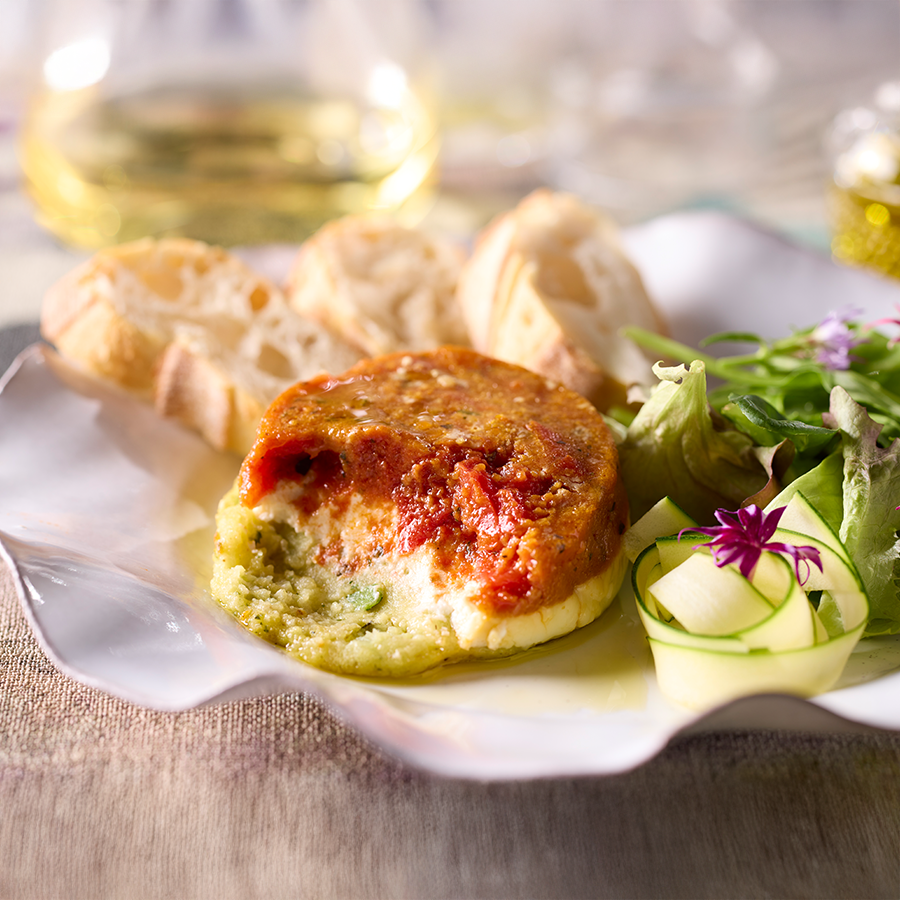 素揚げしたジャガイモとズッキーニ、シェーブルチーズ、粗切りにしたトマトのコンフィの3層の美しいフォンダンです。オーブンで焼き上げてほろっとした食感をお楽しみください。