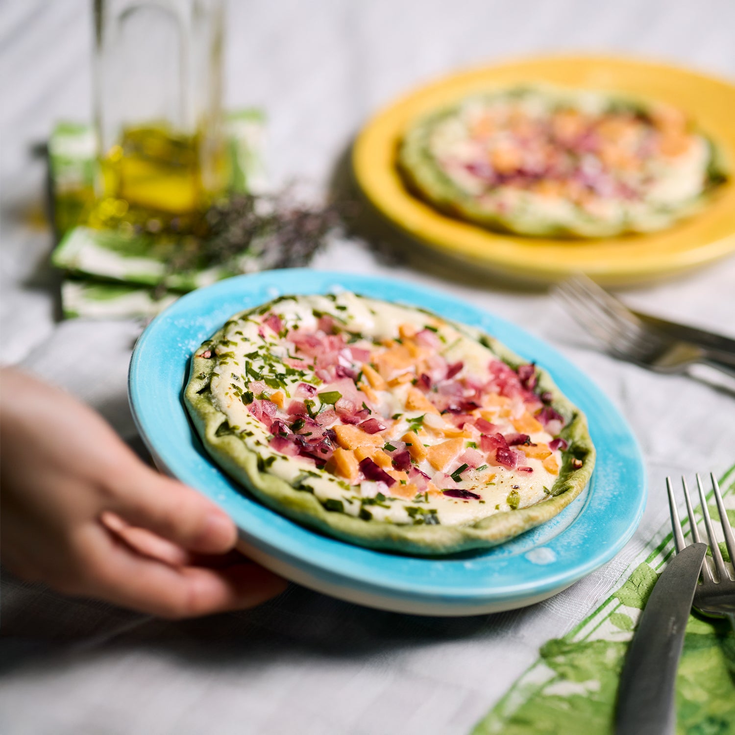 スモークサーモンに赤玉ねぎとチャイブを合わせ、レモン香る軽やかなクリームとほうれん草パウダー入りの生地で仕上げました。縁を編み目状にデザインしたタルトが、見た目にも華やかです。
