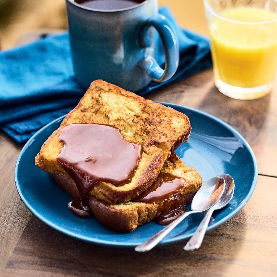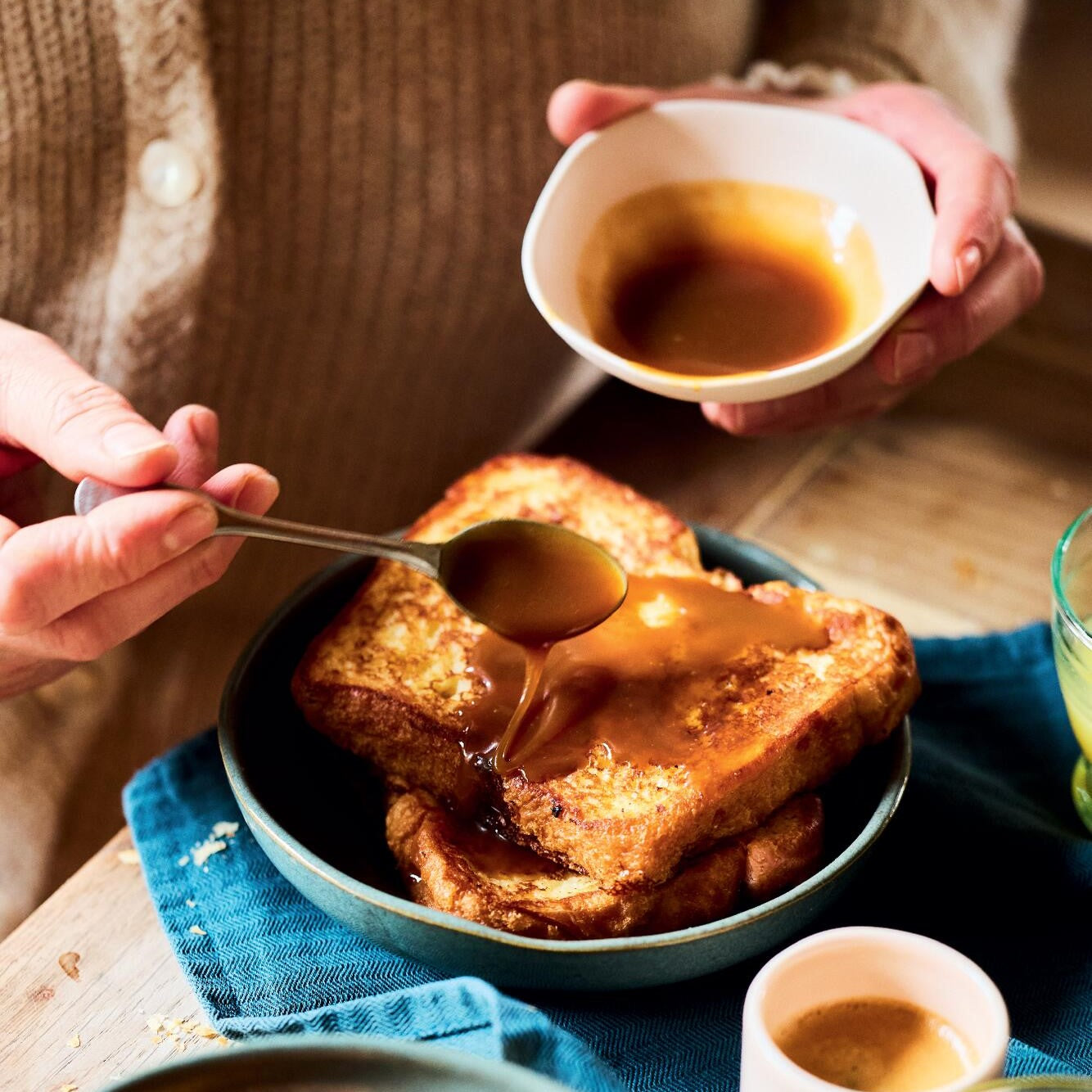ブリオッシュをしっとりとしたフレンチトーストにしました。添付のコクのある塩バターキャラメルのソースを添えてお楽しみください。