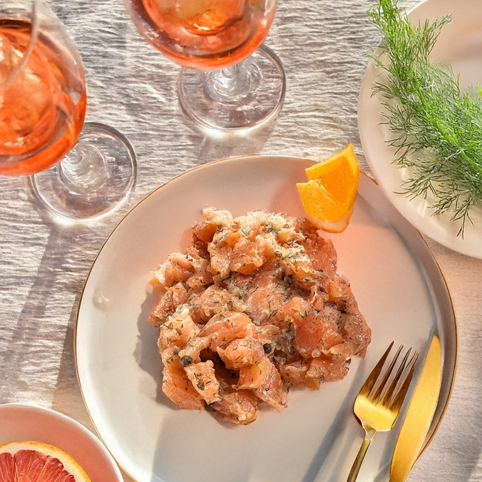 塩と砂糖でマリネしたサーモンにディルとピンクペッパーを効かせ、食べやすい一口サイズにカット。前菜やサラダ、グラス盛りなど幅広く使えます。100gずつの真空パック入り。