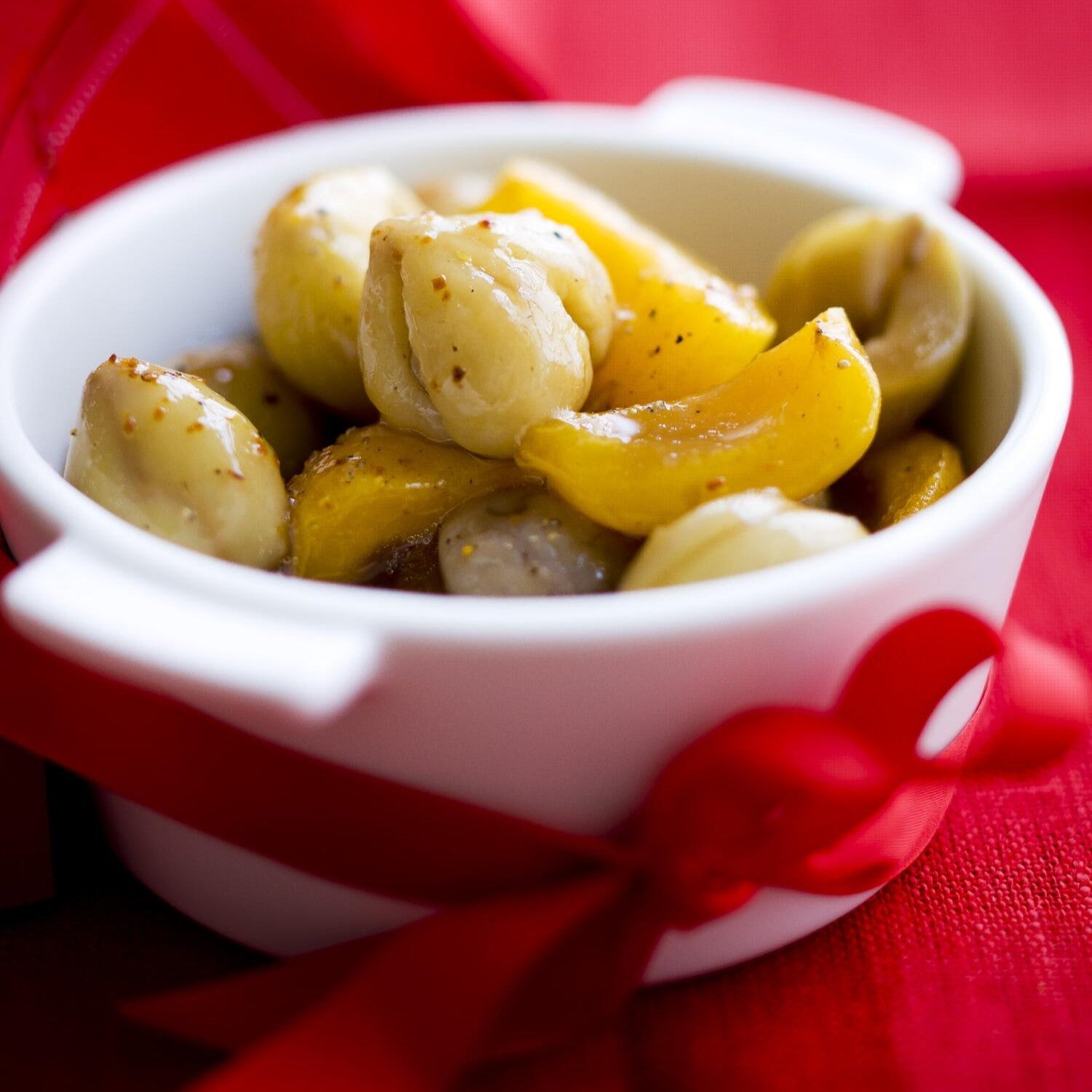 栗、アプリコット、栗ペースト(栗、砂糖、バニラパウダー)、バター(乳成分を含む)、バルサミコ酢(醸造酢)、食塩、赤とうがらし、シナモン