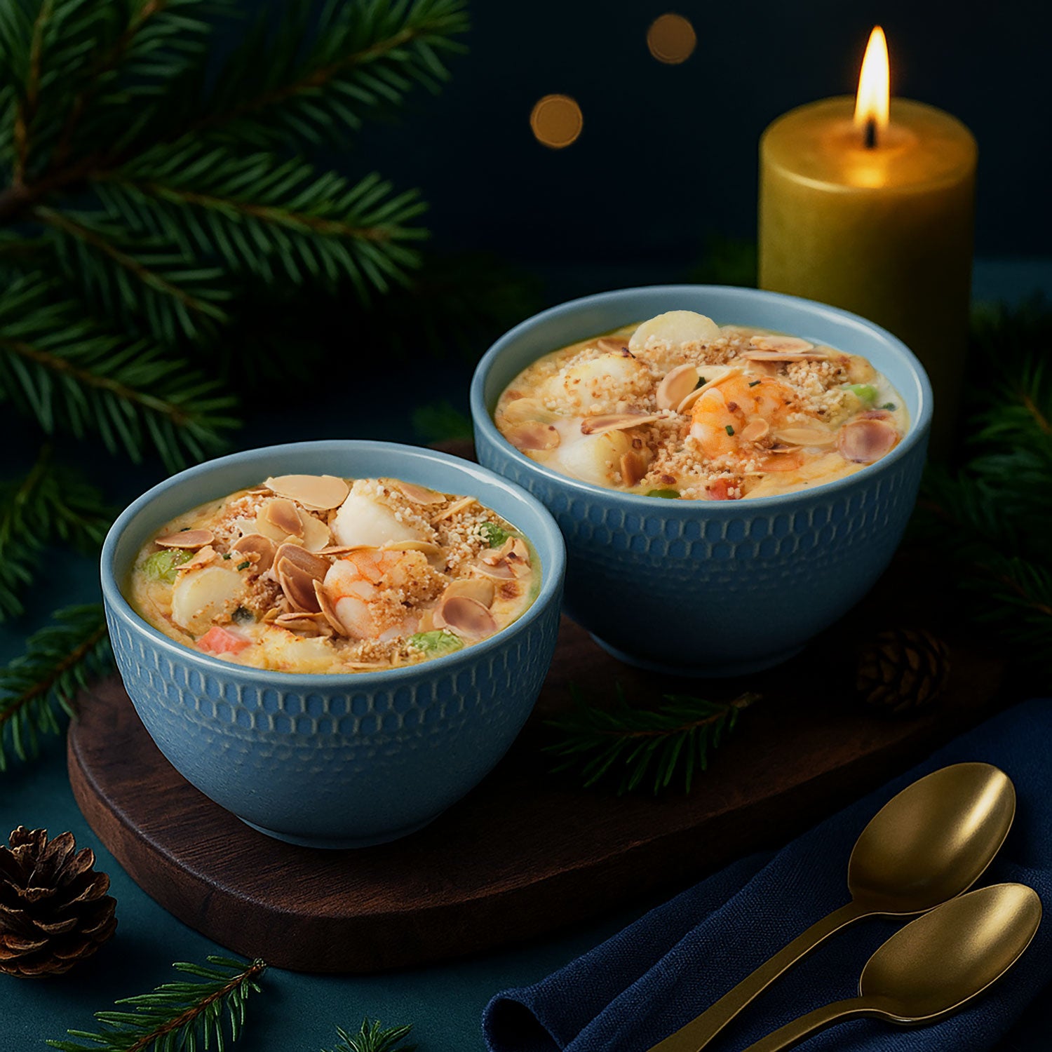 魚フュメ(魚、玉ねぎ、にんじん、セロリ、ポロネギ、バター)、クリーム、アンコウ、白ワイン、むきエビ、パタゴニアホタテ貝柱、ムール貝だし、エシャロット、バターナッツカボチャ、にんじん、枝豆(大豆を含む)、小麦粉、でん粉、シードルビネガー(りんごを含む)、バター、パン粉、脱脂粉乳、バターオイル、加工乳、赤パプリカ、アーモンド、チャイブ、食塩、野菜ブイヨン、レモン果汁、香辛料、パセリ、オリーブ油