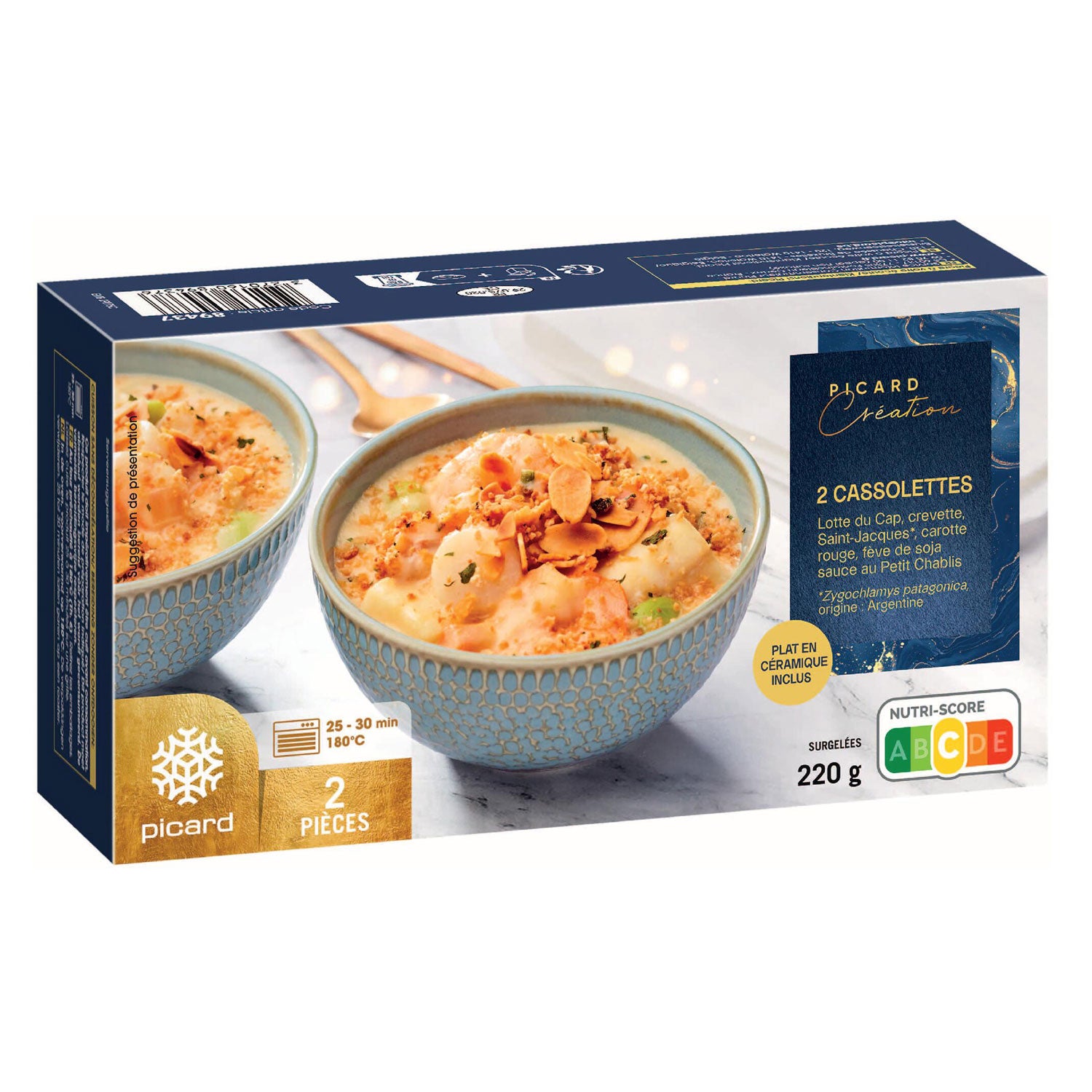 2 cassolettes lotte du Cap,crevette,Saint-Jacques carotte rouge,fève de soja,sauce au Petit Chablis