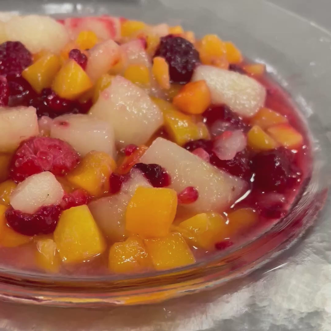 洋なし、黄桃、フランボワーズ、いちごソース(いちご、アガベシロップ、ライム果汁)、濃縮アセロラ果汁