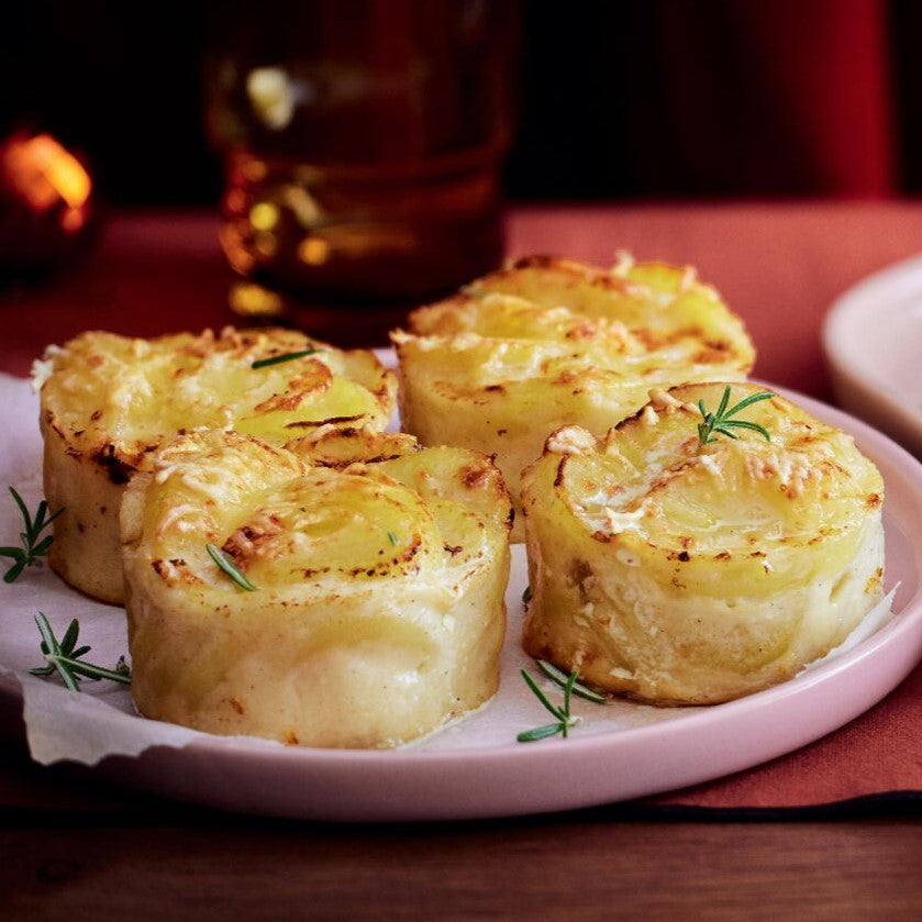 ジャガイモを薄くスライスし、スイス産エメンタールチーズと生クリームでやさしくクリーミーに仕上げたミニグラタンです。エメンタールチーズはナッツのような香ばしい風味と、ほどよい塩気が特徴で、ジャガイモの甘みとよく合います。
