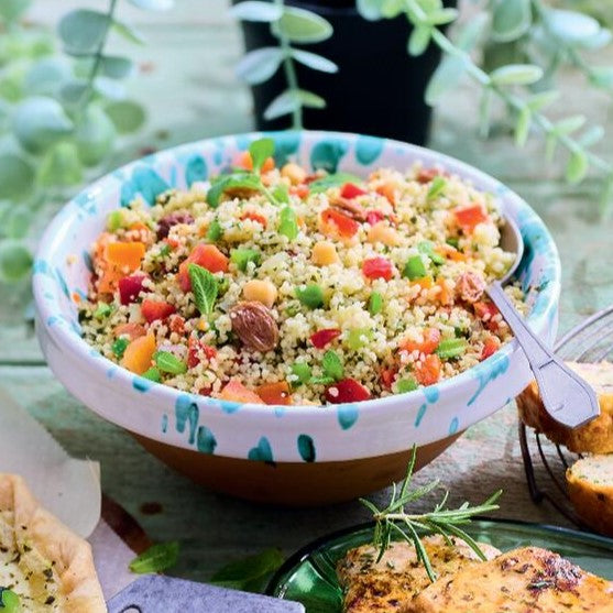 クスクス(デュラム小麦のセモリナ)、トマト、赤パプリカ、レモン果汁、植物油脂、ピーマン、ひよこ豆、玉ねぎ、ミント、レーズン、食塩、パセリ、はちみつ、濃縮トマトピューレー、白こしょう