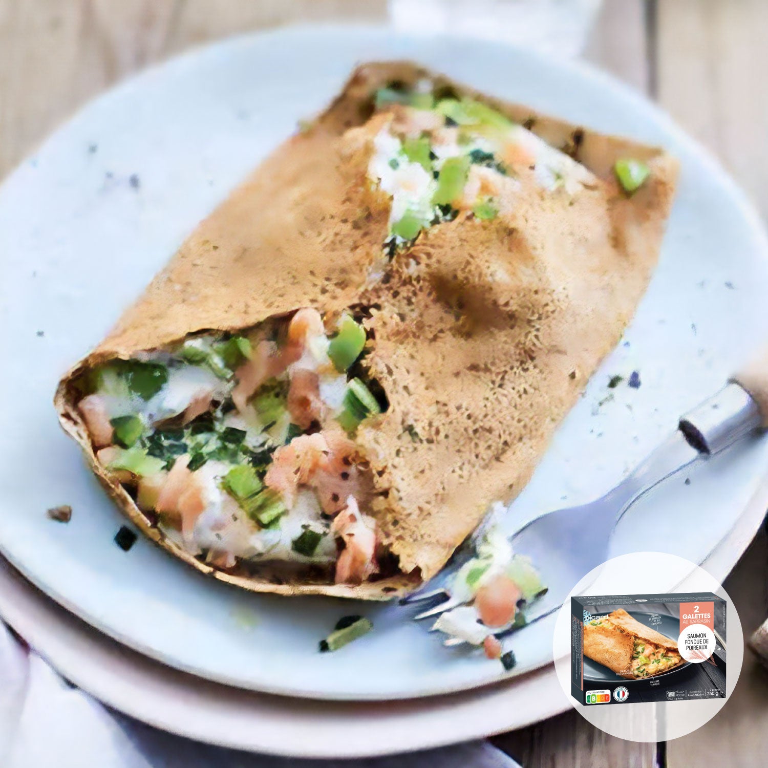ノルウェー産のサーモンとフランス産のポロネギを、生クリーム、粒入りマスタード、フロマージュブランのソースで味付けし、そば粉のガレットのフィリングにしました。軽めのお食事に最適です。