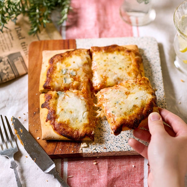 クリスプタイプの生地に、イタリアを代表する 4種類のチーズ(モッツァレラ、プロヴォローネ、ゴルゴンゾーラ、アジアーゴ) を使ったピッツァです。レンジで温めるだけで、ファストフード感覚でお召し上がりいただけます。