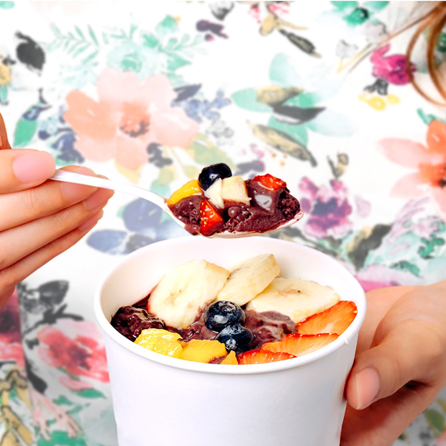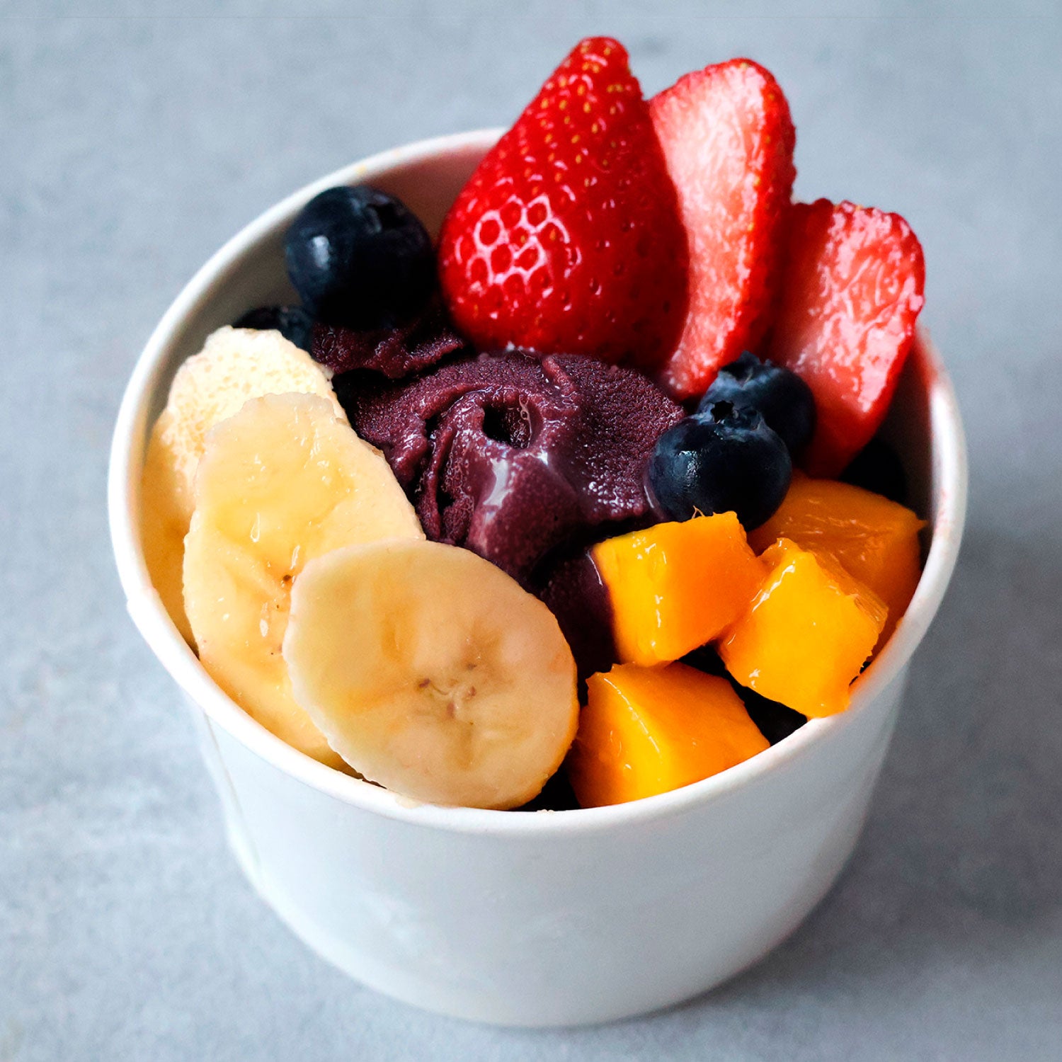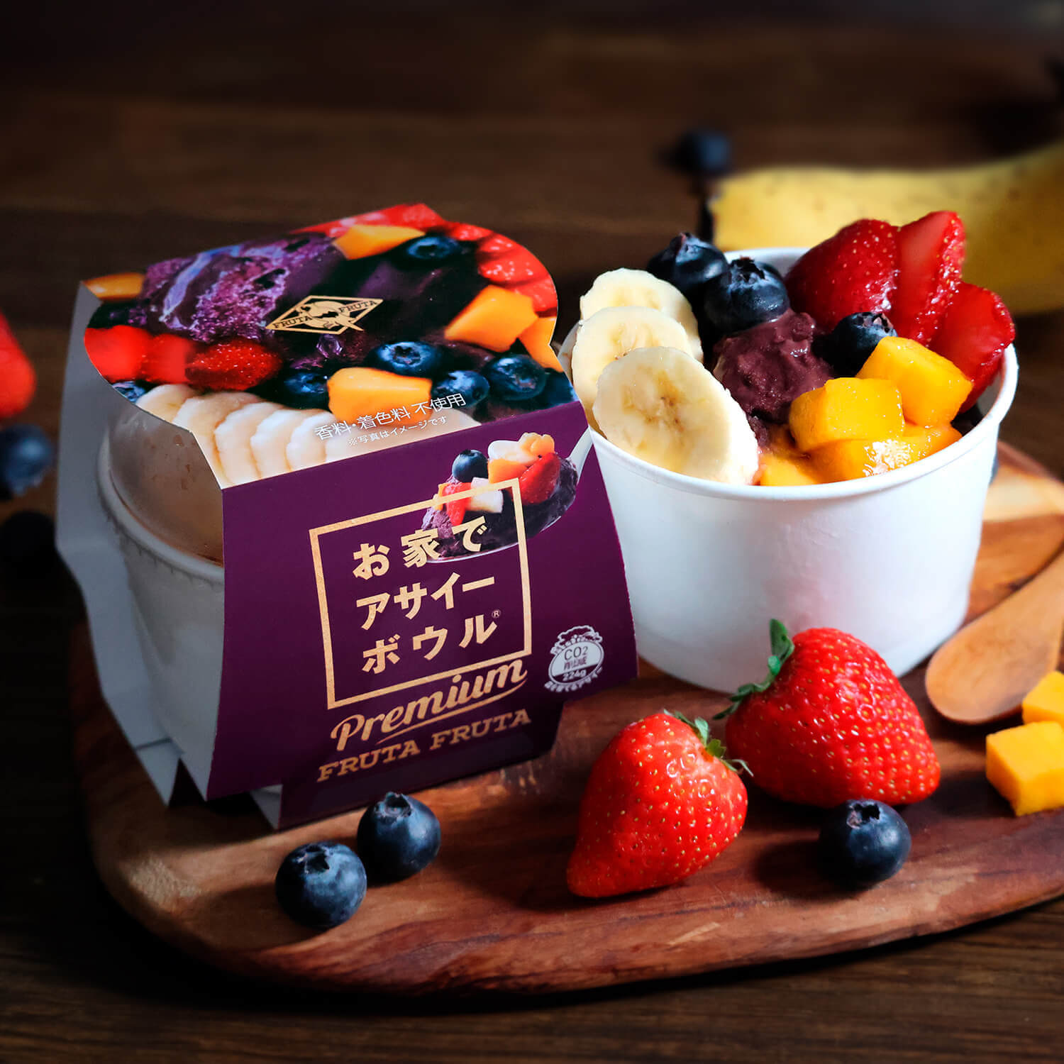 冷凍庫から出してすぐに食べられるカップ入り濃厚アサイーボウルミキサーも盛り付けも不要!カフェやレストランで人気のアサイーボウルを冷凍庫から出してすぐにお召し上がりいただける、カップ入りアサイーボウル。シンプルかつ味わい深いアサイーのアイスをベースに、厳選された王道のフルーツをトッピングしました。固く感じられる場合は冷蔵庫で5~10分を目安に解凍してお召し上がりください。