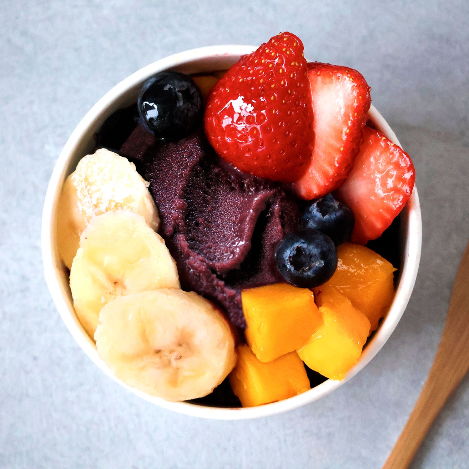 厳選したフルーツトッピングアサイーボウルのトッピングの王道である、バナナ、いちご、マンゴー、ブルーベリーを一つずつ真心込めて丁寧にトッピング。まるでカフェのような、目にもうれしい、にぎやかな一品に。